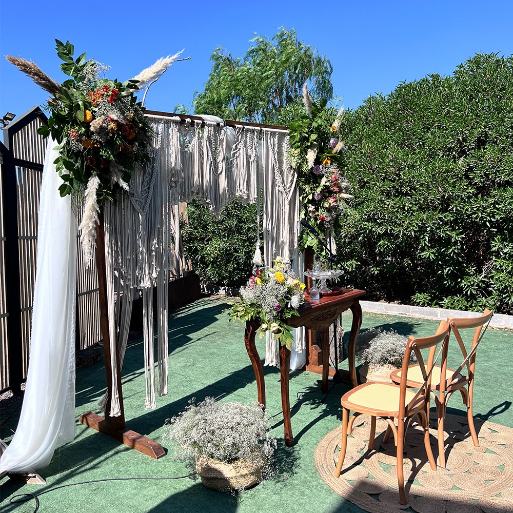 Salón climatizado para cena/fiesta y áreas al aire libre para ceremonia y cóctel. Decoración adaptable (Boho Chic, Campestre o Vintage).