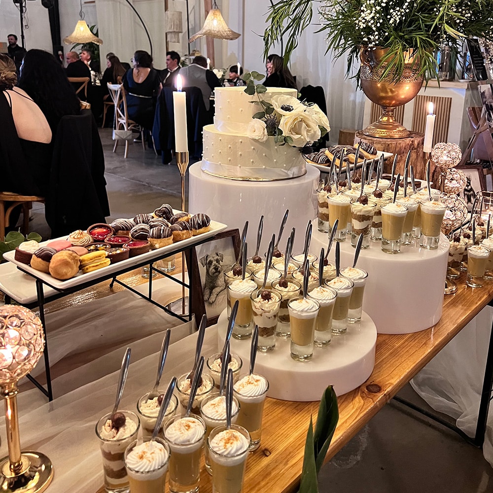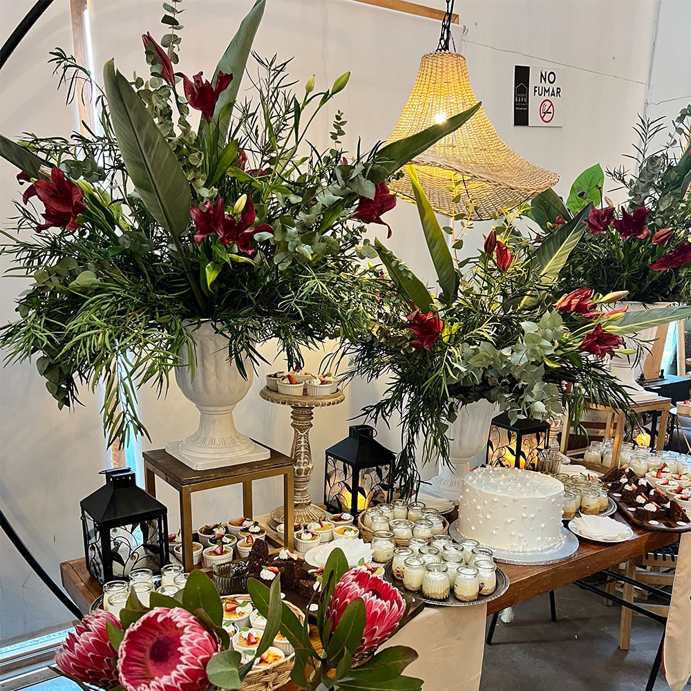 Menús personalizados: banquete, estaciones de comida o asados campestres. Barra de cócteles y vinos; mesa de postres.